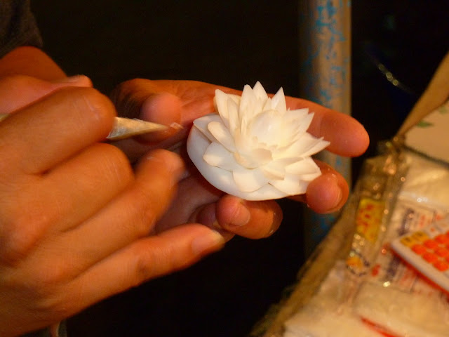 The soap flowers were purchased at the night market in Chiang Mai. Here is the seller at his stall, carving a flower out of soap.